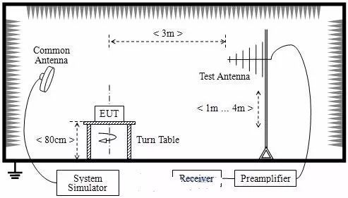 辐射杂散骚扰的功率点是通过“置换测试法”来确定的。用电波暗室先进行预校正(由信号源和基准天线组成)再置换移动台来进行发射,通过测试接收机得到相同的功率后,则此时预校正器的发射功率就是EUT(被测物)辐射杂散骚扰的功率电平。